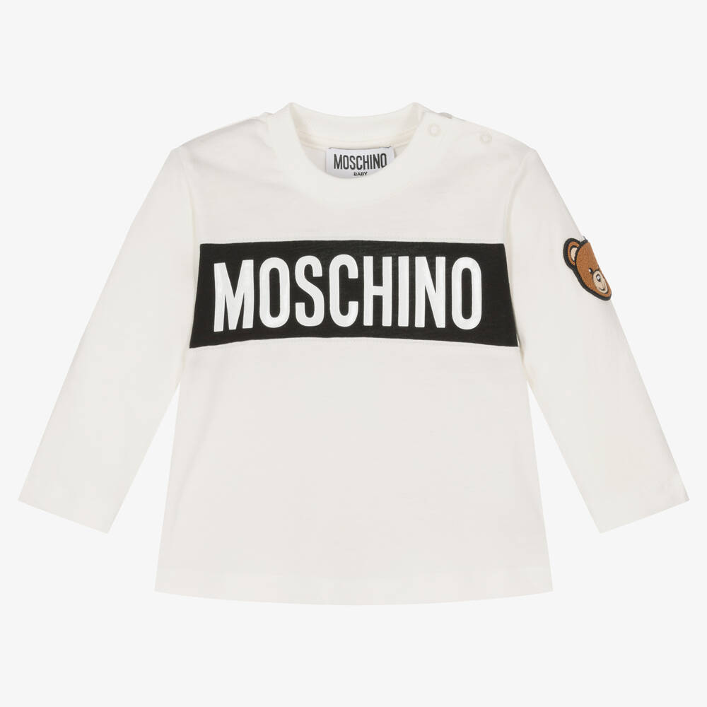 From Moschino Baby is this ivory cotton top for little boys and girls, with an easy shoulder popper fastening. It has a black logo print on a white panel and the brand's instantly recognisable Moschino Teddy Bear bouclé appliqué on one sleeve.