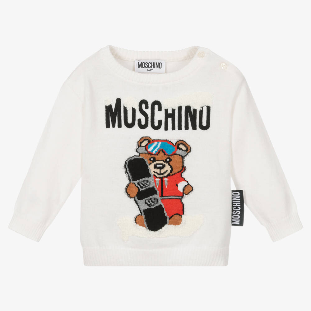 Ivory sweater for little boys and girls by Moschino Baby, knitted in a soft cotton and wool blend. Snug and warm, this classic crew neck sweater has a sweet winter-themed Moschino Teddy Bear Logo holding a snowboard on the front, with black logo embroidery above. It has stretchy ribbed cuffs, a black and white logo tab on one side, and useful popper fastenings on one shoulder for easy dressing.