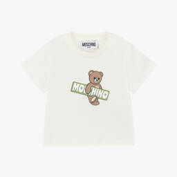 In a neutral shade of pale ivory, this cute T-shirt for little boys and girls is designed by Moschino. Made in soft cotton piqué, it has the brand's iconic Moschino Teddy Bear logo print on the front for instant recognition. The popper fastenings on one shoulder help with dressing.