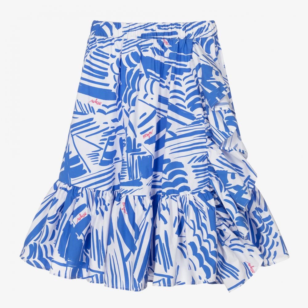 Girls blue and white skirt by MSGM, made from soft, lightweight cotton. With an elasticated waist for comfort, it has an abstract blue and white design with the brand's logo print in fuchsia pink, and a lovely ruffle trim on the front.