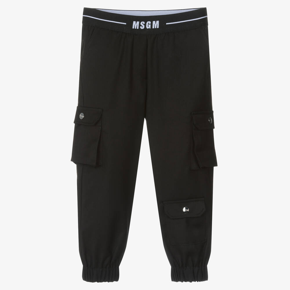 Stylish yet comfortable, these black cargo trousers for girls are by Italian brand, MSGM. Made in soft viscose-blend twill, they have jogger styling with an elasticated logo-jacquard waist and cuffed ankles. There are slanted front pockets and the patch pockets on the legs fasten with logo poppers for a discreet designer touch.