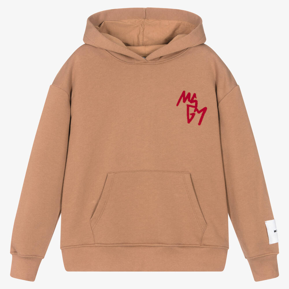 Dark beige hoodie for teen boys by MSGM, with an angular red flocked logo on the front,giving and edgy, urban look. Made in mid-weight cotton jersey, it has a fleecy inside for extra warmth and comfort. There is a kangaroo pocket on the front and a white label on one sleeve with a black rubberised logo for a subtle designer finish.