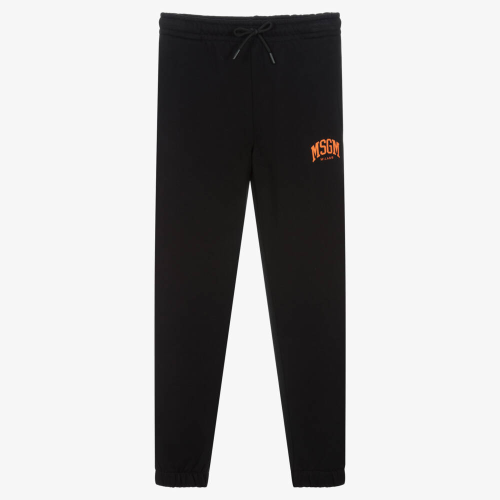 Black joggers for teen boys by MSGM, with a bold orange logo print on one leg. Made in soft, mid-weight cotton jersey, they are fleecy on the inside for extra warmth. They have concealed side seam pockets and a back patch pocket. There is a useful drawstring waist for a comfortable fit and a colourful logo patch on the back for a bright designer finish.