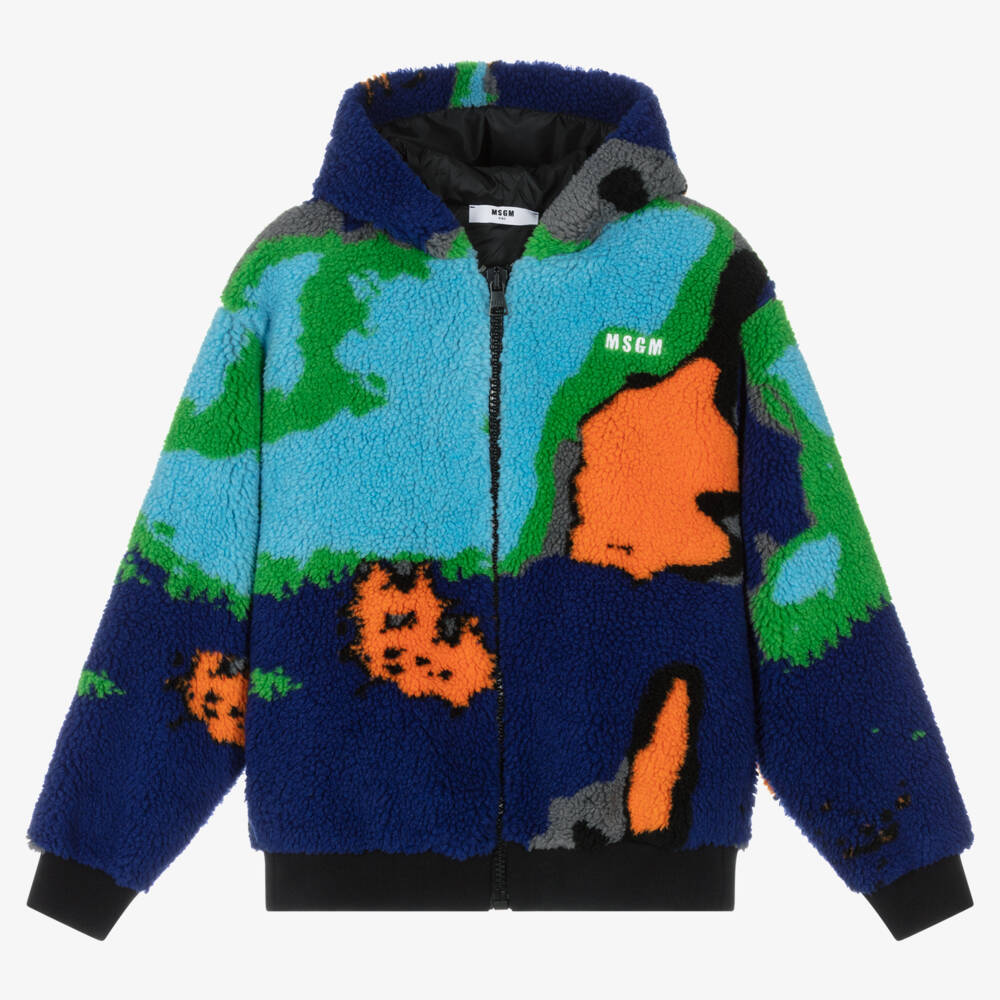 Colourful hooded zip-up top for teen boys by MSGM, with a white embroidered micro logo on the chest. Patterned with a bright green, blue and orange melted paint effect design, it makes an eye-catching statement. Made in soft sherpa fleece for a warm, cosy feel, it has a silky lining, concealed side seam pockets and ribbed trims.
