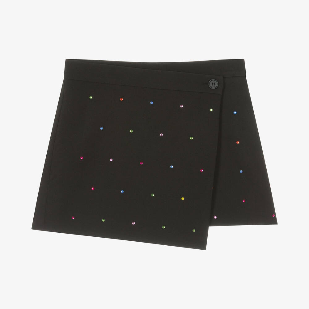 A gorgeous black skort for teen girls by Italian brand MSGM, decorated with colourful jewel embellishments on the wrap front. Designed to look like a mini skirt, this lightweight design fastens with a zip at the side and a branded button on the front. It is fully lined with soft voile for a comfortable feel.
