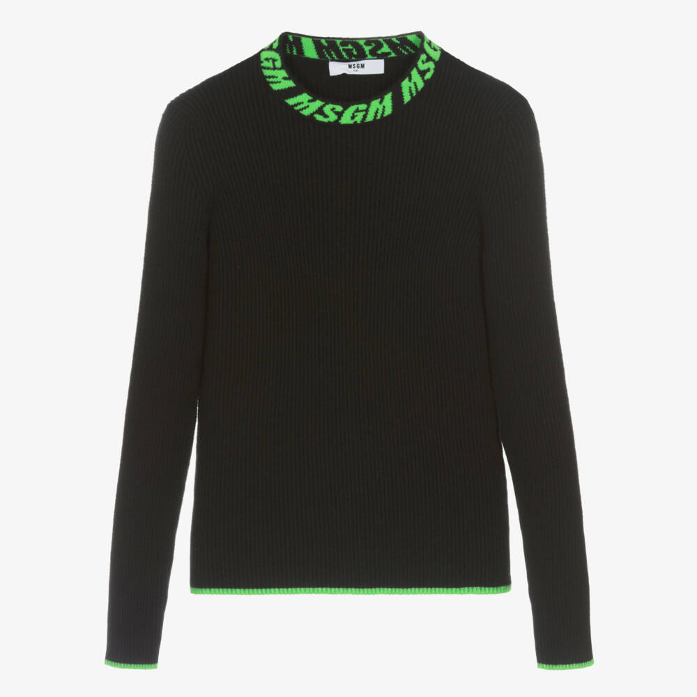 Black ribbed jumper for teen girls by MSGM, with a green jacquard logo on the neckline and matching stripe trims. Made in a super soft viscose-blend knit, it has a luxurious, cosy feel.