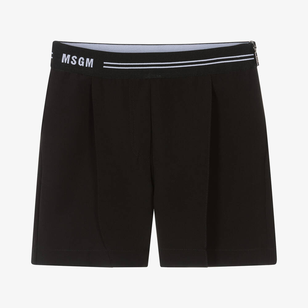 Chic black tailored shorts for teen girls by Italian brand MSGM, made in silky smooth smart fabric. The elasticated black logo waistband adds a contemporary touch to an otherwise classic silhouette, whilst the side logo zip makes dressing fuss-free. They are finished with front pleats and concealed side pockets.
