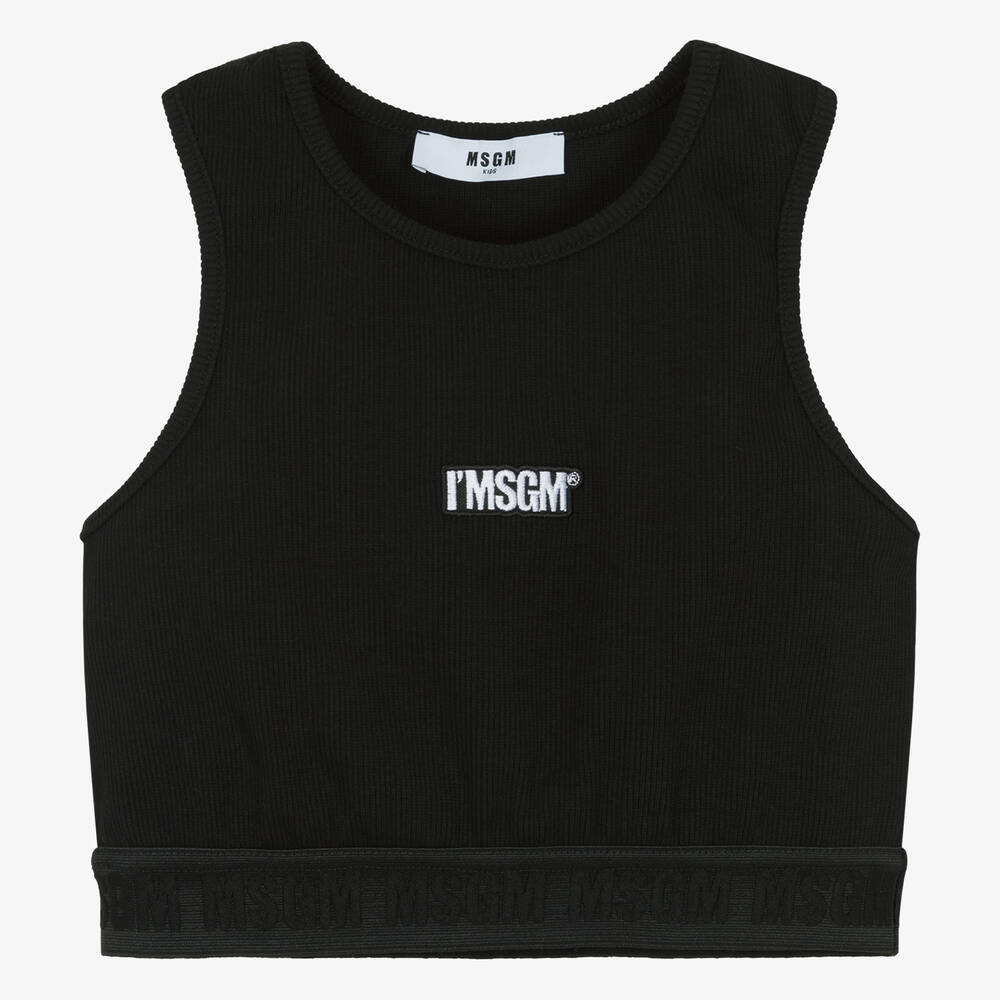 Ideal for casual sportswear, a black cropped top for teen girls by Italian fashion house MSGM. For instant brand recognition, it has a white embroidered logo on the front, with repeat jacquard logos on the elasticated underband. Super comfortable for activewear, this sleeveless top is made in stretchy ribbed cotton jersey.
