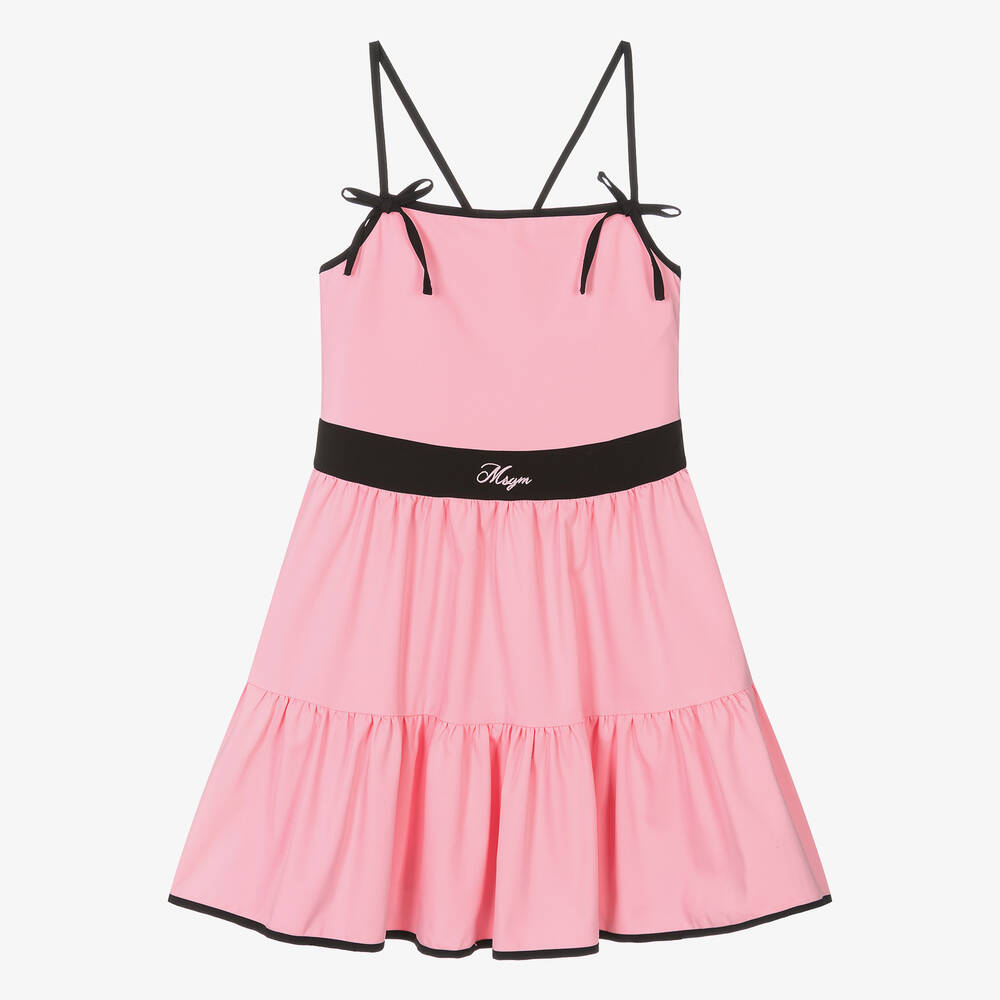 Teen girls pink cotton-blend dress by Italian brand, MSGM, with a contrasting black waistband embroidered with a pink italic logo. It has thin black straps with pretty bow embellishments and a black-trimmed, frilled hem for feminine flair. There is a concealed zip fastening on the side with a silver branded pull.