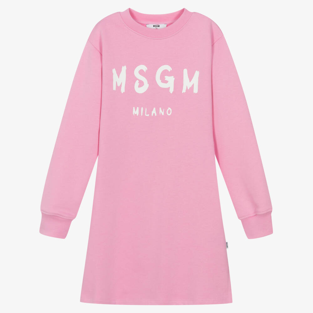A pink cotton jersey sweatshirt dress for teen girls by Italian brand MSGM, with a bold white brushed logo print. It has a flared skirt with an elasticated back to cinch in the waist, creating a feminine streetwear look.