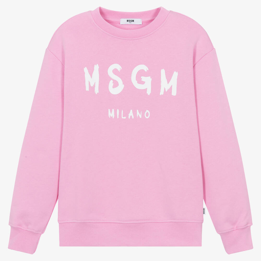 Pink cotton sweatshirt for teen girls by MSGM, with the Italian brand's bold white brushed logo printed on the front. Made in mid-weight jersey with a cosy fleece feel inside, this comfortable top has casual ribbed trims and an embroidered tab on the side seam for a designer finishing touch.