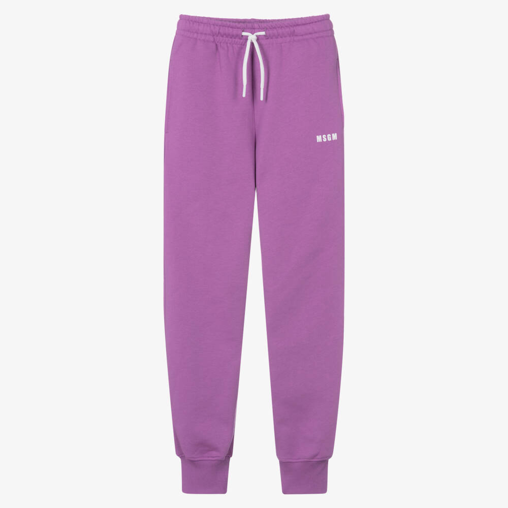 From Italian brand MSGM, a pair of lilac purple joggers for teen girls with a white micro logo print on the front. Made in mid-weight cotton jersey, this casual cuffed style has a drawstring waist for a comfortable fit and concealed side seam pockets. To complete the designer look, there is a branded tab on the back patch pocket.