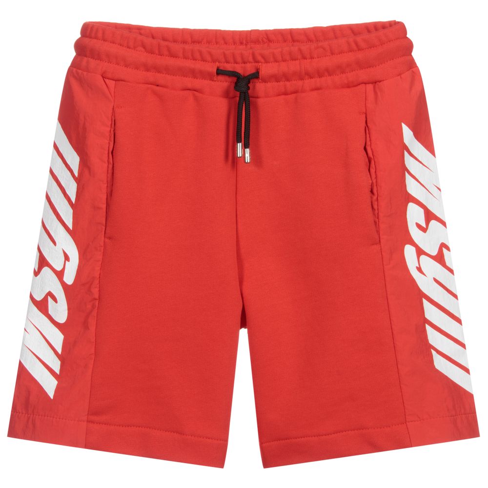 Teen boys red longer length shorts by MSGM, with silky nylon side panels. The stretchy jersey fabric and white logo prints reflect the designer's quest for combining bold branding and comfort. They have a black drawstring on the waistband and front pockets.