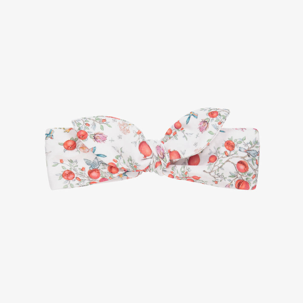 White headband for baby girls by My Little Pie, patterned with a charming red, pomegranate design. Made in super soft, organic Supima cotton jersey, this sweet accessory has a bow on the top and a gently elasticated back, allowing it to sit comfortably on the head.