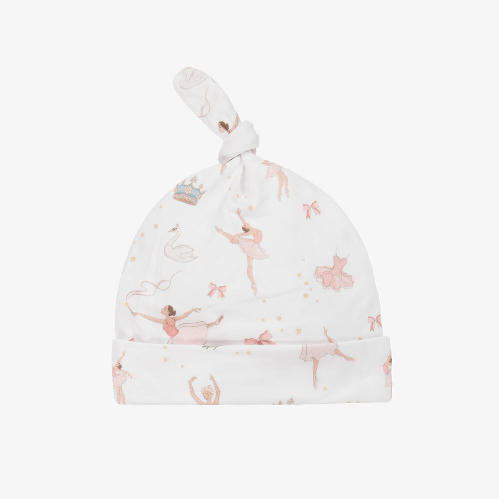 A charming white layette hat for baby girls from My Little Pie, patterned with a lovely ballerina and swan design in pink. Made in beautifully soft organic Supima cotton jersey, this comfortable hat has a sweet turn-up brim and a cute top knot.