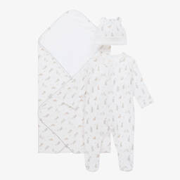 Lovely white babygrow and hat set for boys and girls from My Little Pie, with a beautiful blue and yellow porcelain tile print. Ideal for delicate skin, the set is made in super soft organic Supima cotton jersey. The babygrow fastens easily with poppers on the front and smaller sizes have practical, fold-over scratch mitts. The cute layette hat is designed with a turn-up brim and top knot.