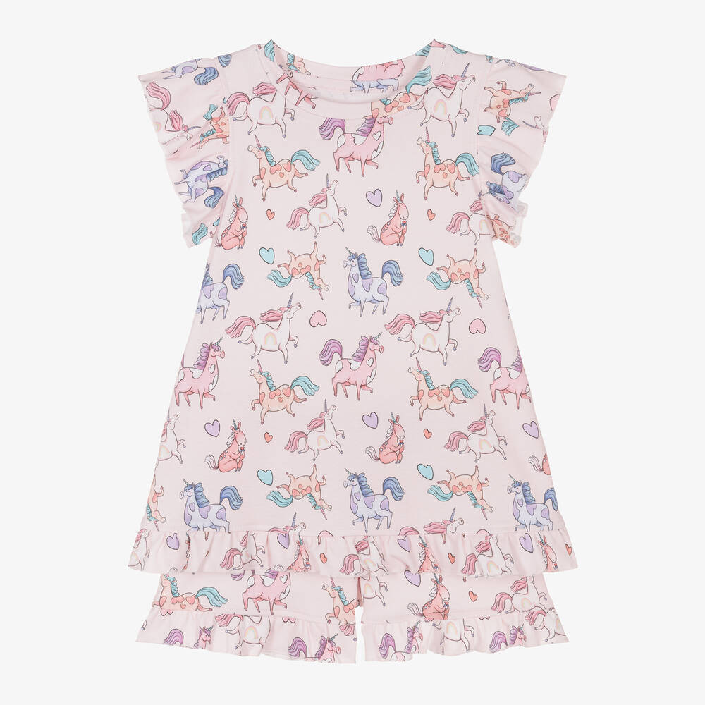 Pretty pink pyjamas for girls by My Little Pie, made in beautifully soft, organic Supima cotton jersey. Patterned with adorable unicorns, this charming set has sweet ruffle trims. The short-sleeved top slips easily over the head and the shorts have a gently elasticated waistband for a comfortable fit.