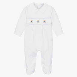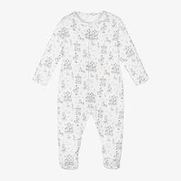 An adorable white babygrow for boys and girls by My Little Pie, with a gorgeous print of carousels, rocking horses and balloons in shades of pale blue and beige. Made in super soft organic Supima cotton jersey, it has poppers on the front for easy dressing. A sweet Peter Pan collar and delicate pale blue picot trims add a pretty finish.