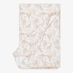 White jersey blanket for baby girls by My Little Pie, made in soft organic Supima cotton. Making a lovely addition to the nursery, it has a pretty pink and grey design featuring nursery toys, bunny rabbits, dresses and bows. It has a pretty ruffle trim all around for added charm.