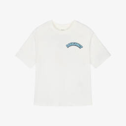 White T-shirt for boys by NAME IT, made in soft organic cotton jersey. Casual and comfortable, it has a cool doughnut graphic on the back and a smaller matching design on the front.