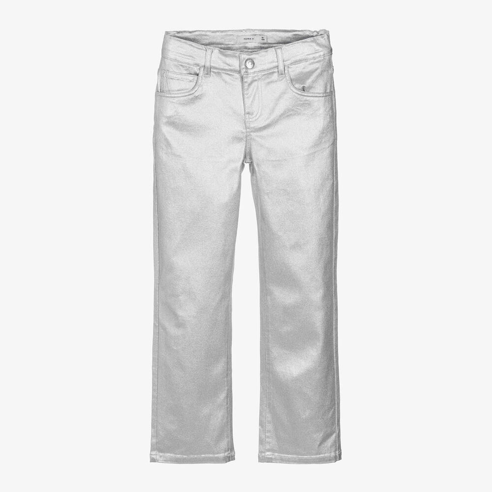 Great for a casual party look, these metallic silver straight-leg jeans for girls are by NAME IT. Smooth and stretchy, this eye-catching style has an adjustable waist for a comfortable fit. Designed with the classic five-pocket detailing, they fasten with a zip and hook on the front.