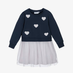 Navy blue dress for girls by NAME IT, in a lovely layered design. The sweatshirt-style bodice is made from soft organic cotton jersey with pretty heart appliqués on the front and a classic ribbed crew neckline for a cosy fit. The skirt is made from soft gathered tulle, with a comfortable jersey lining.