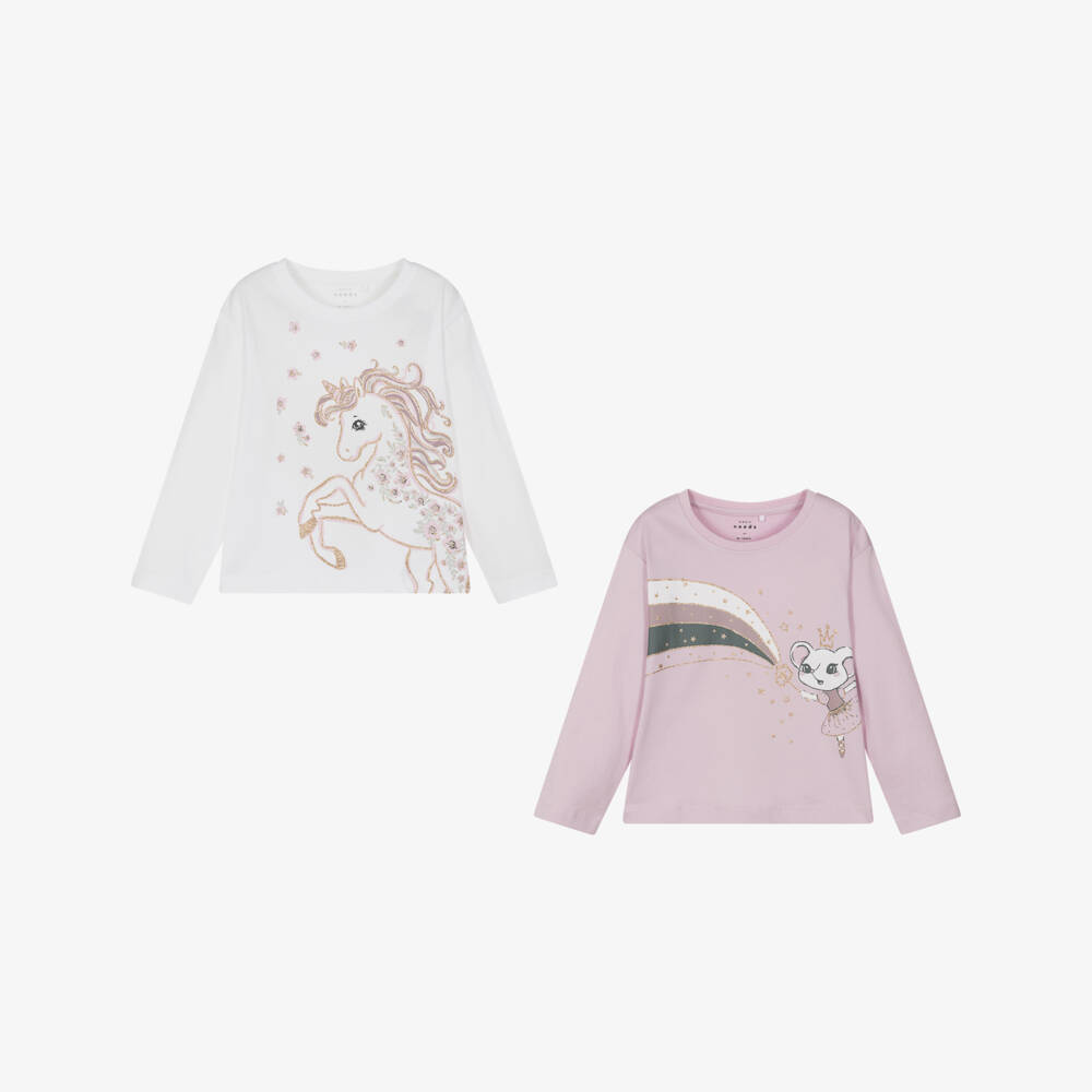 Orchid pink and white tops for girls by NAME IT, in a handy two pack. Made in soft cotton jersey, these long-sleeved tops feature cute, magical designs on the front with glittery gold detailing.