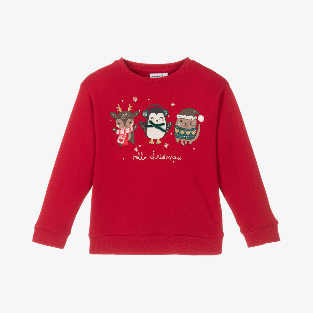 Красный свитшот для девочек от датского бренда Name It из мягкого органического хлопкового трикотажа с начесом внутри. Теплый и уютный, с веселым праздничным принтом животных спереди с милым оленем, пингвином и котом.