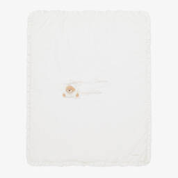 A lovely light pink blanket for baby girls by Nanán, made in soft cotton jersey with light padding. Ideal for the cot or pram, this cute accessory has a decorative ruffled trim around the edge and a sweet teddy bear appliqué on the front. The tonal embroidery reads 'Sleep... sleep little angel' in Italian, along with the brand's name seen in one corner. It comes with a buttoned fabric bag for easy storage.