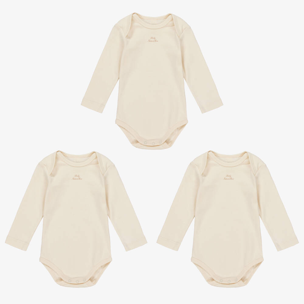 A three-pack of ivory bodyvests for baby boys and girls by Naturapura. Made from the softest organic cotton jersey, these babysuits have a stretchy envelope neckline and popper fastenings for easy dressing. A beige logo is printed on the front.