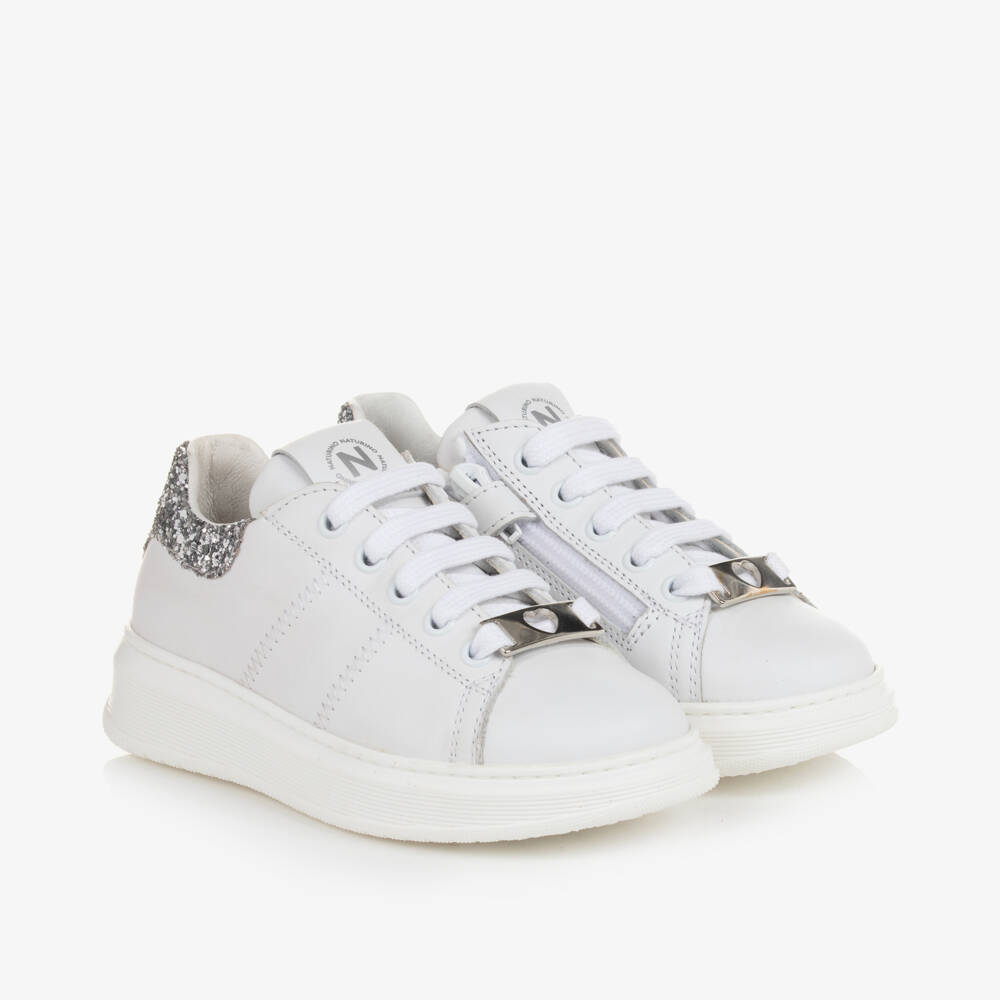 White and silver trainers for girls from Naturino, with a sparkling glitter panel on the heel. Lightly padded on the ankle and inner sole, these beautifully soft leather shoes are designed to support little feet as they grow. The insole and lining are made from leather for added comfort with each little step. They have flexible, rubberised soles, a logo label on the tongue, and a sweet silver-tone plaque with a heart cut-out design on the toes. Easy to slip on, they are designed with laces, a side zip fastening and velcro tab for neat, simple simple dressing.