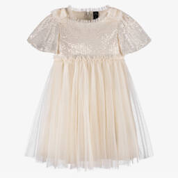 Girls Beige & Gold Sequin Tulle Butterfly Dress