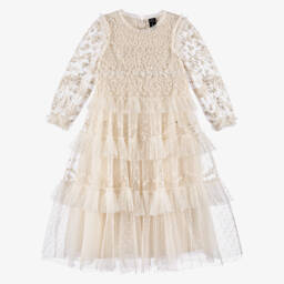 Beautiful pink dress by Needle & Thread, offering an elegant special occasion look for girls. Crafted from the label's signature 'kisses' tulle, it features intricate blossom embroidery and shimmering sequins for a delicate sparkle. The dress is styled with sheer long sleeves and a series of ruffled tiers that add graceful volume and movement. Fully lined, it fastens neatly at the back with a concealed zip.