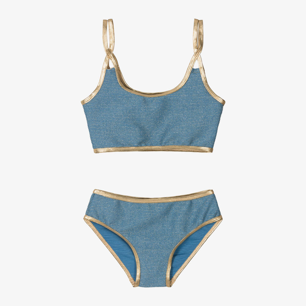 A glittery blue bikini for girls by Nessi Byrd, in a stretchy ribbed UV50 fabric with a lightweight lining. Creating a pretty resortwear look, this sparkly bikini has shiny metallic gold trims with cross-over detail shoulder straps on the scoop neck top.
