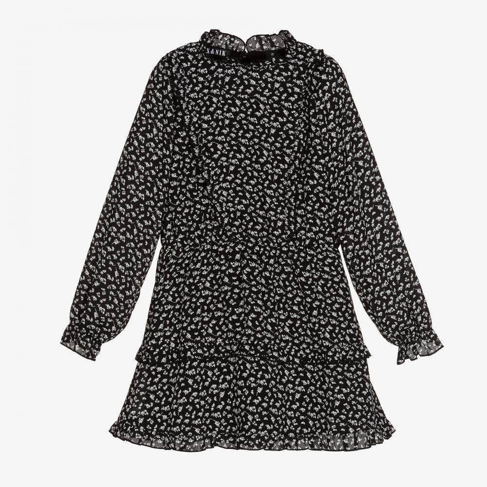 Pretty black dress for girls by NIK&NIK, with a white floral print. Made in recycled polyester crêpe, it has frilled trims with a gently elasticated waistband and cuffs. It is fully lined in super soft, lightweight viscose.