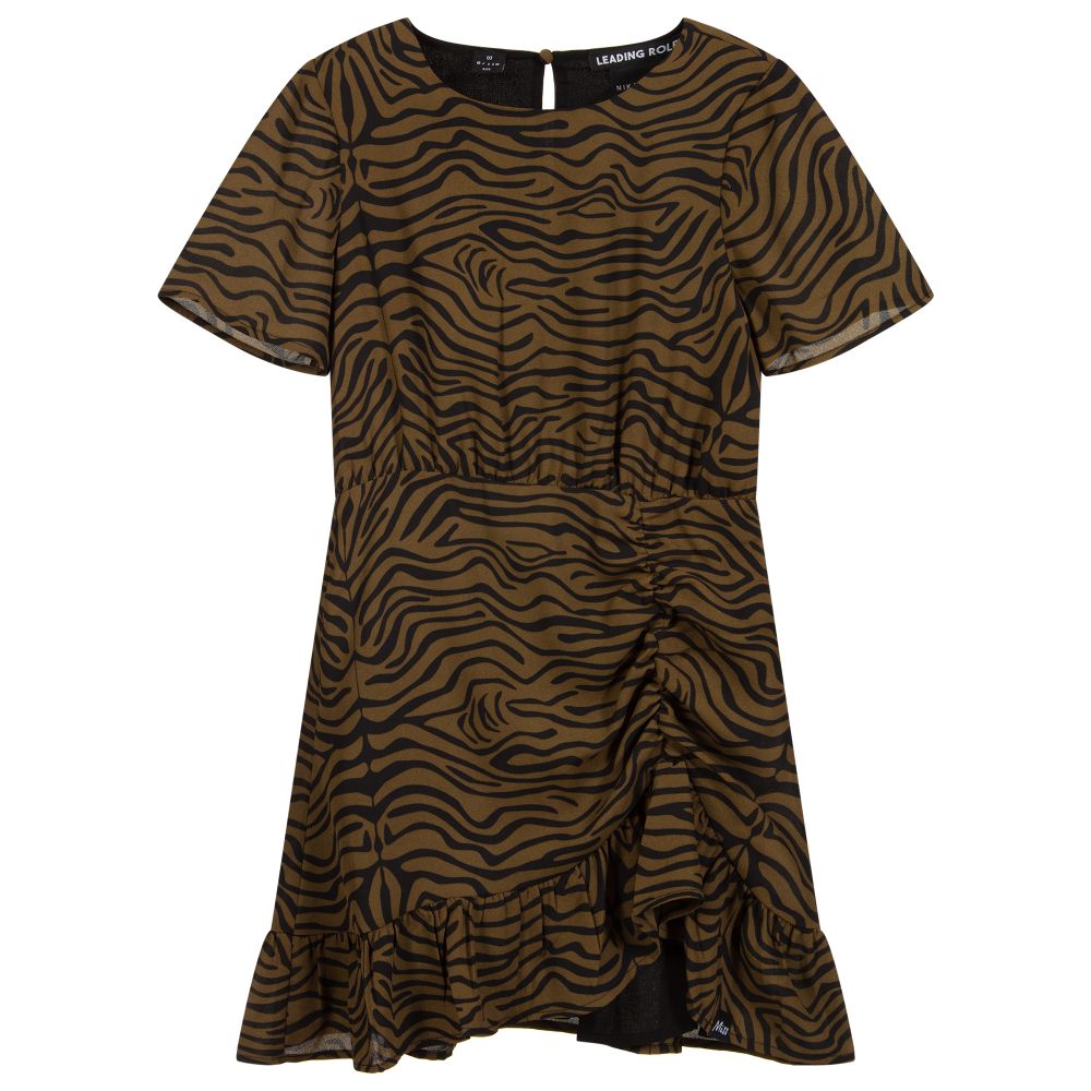 Khaki green and black zebra print dress for girls by NIK&NIK, made in soft, silky polyester. It has pretty ruffles and ruched detailing on the skirt. There is a soft, silky viscose lining and it fastens with a single button on the back.