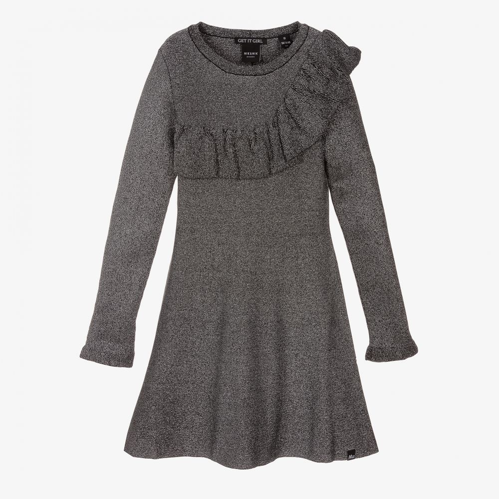 Teen girls sparkly black and silver dress from NIK&NIK, knitted in a double-layered viscose blend. In a flattering fit-and-flare style, it has ruffles across the bodice and ribbed trims. The designer's black logo tab is on the front hemline.