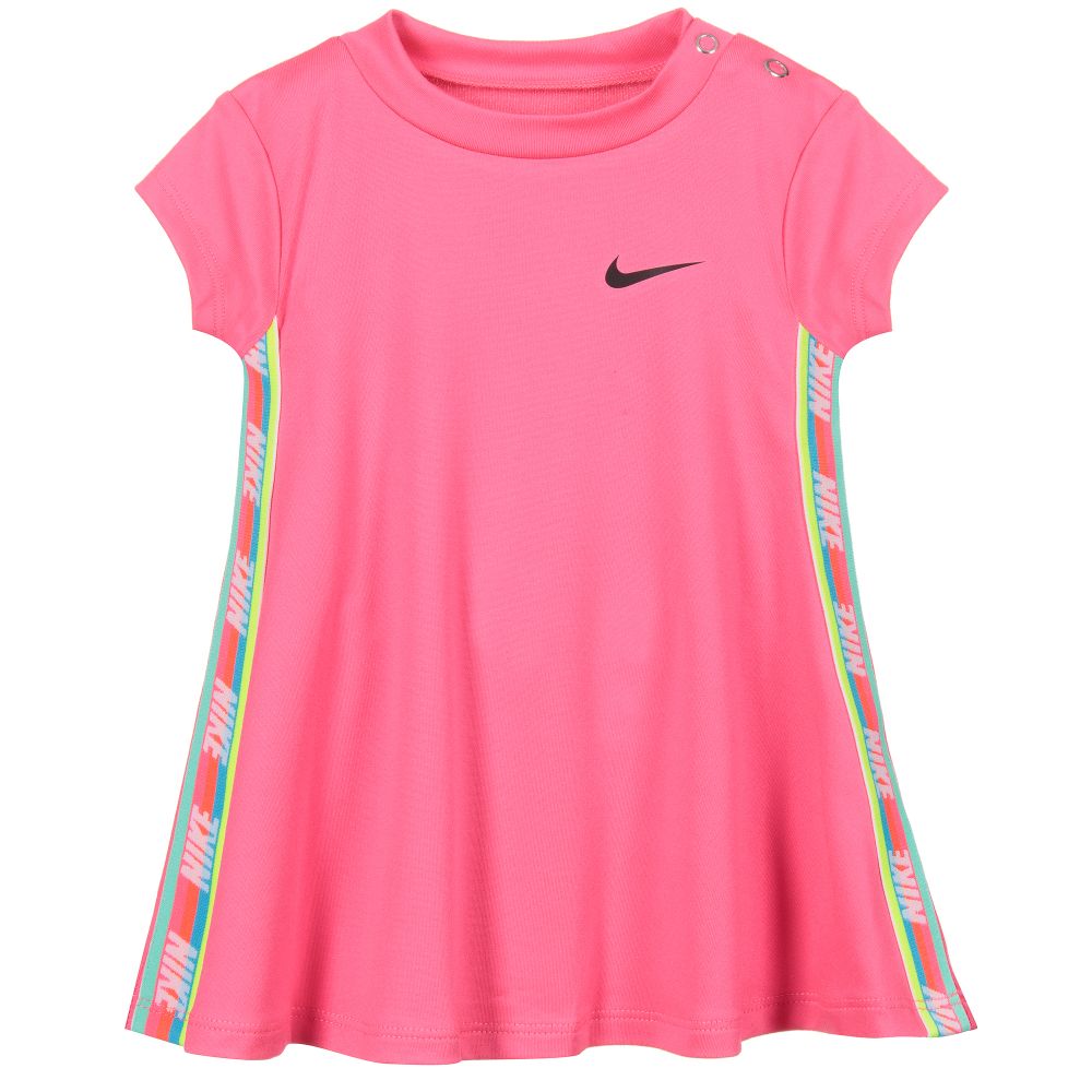 Bright pink dress with black knickers for baby girls by Nike, with swoosh logo prints. Both pieces are made in silky polyester jersey, using Dri-Fit technology designed to keep the skin dry and comfortable. The dress has multicolour striped logo tape down the sides.