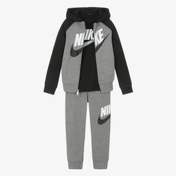 A grey marl and black tracksuit set for younger boys by Nike, made from a super soft cotton blend jersey. This comfortable outfit includes a coordinating zip-up hoodie, joggers and a black T-shirt printed with the iconic Swoosh logo for a sporty casual look.