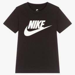 White T-shirt for boys by Nike, made in soft cotton jersey with a black Swoosh logo print on the front.