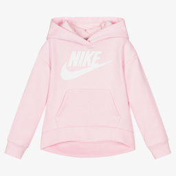 Girls black hoodie by sports brand, Nike. Made in mid-weight polycotton jersey, with a brushed fleece inside, this casual top has the brand's logo printed across the front in white, with a pouch pocket underneath.