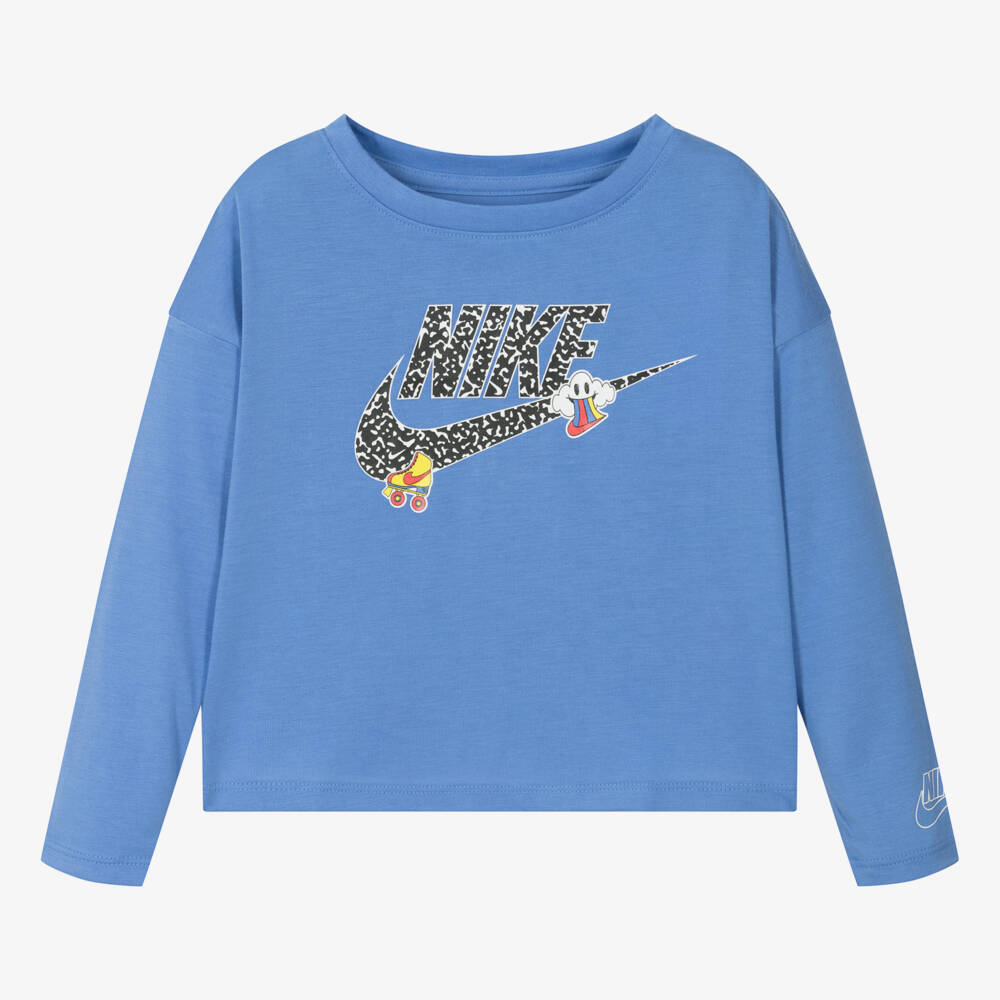 In cornflower blue, a long-sleeved top for girls from Nike, made from soft and stretchy jersey. With dropped shoulders, this boxy-fit top has the famous Swoosh logo on the front reimagined in a black and white abstract design, with roller skates and a fun rainbow cloud. A further Swoosh print on the cuff completes this cool style.
