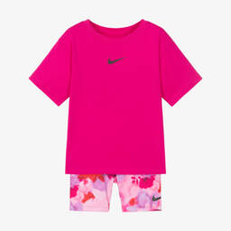 Brighten her active days with this lilac and green shorts set for girls by Nike. The soft cotton jersey T‑shirt showcases the brand's iconic Swoosh logo, while the floral cycling shorts bring lively colour and all‑day comfort thanks to their smooth fit and elasticated waist.