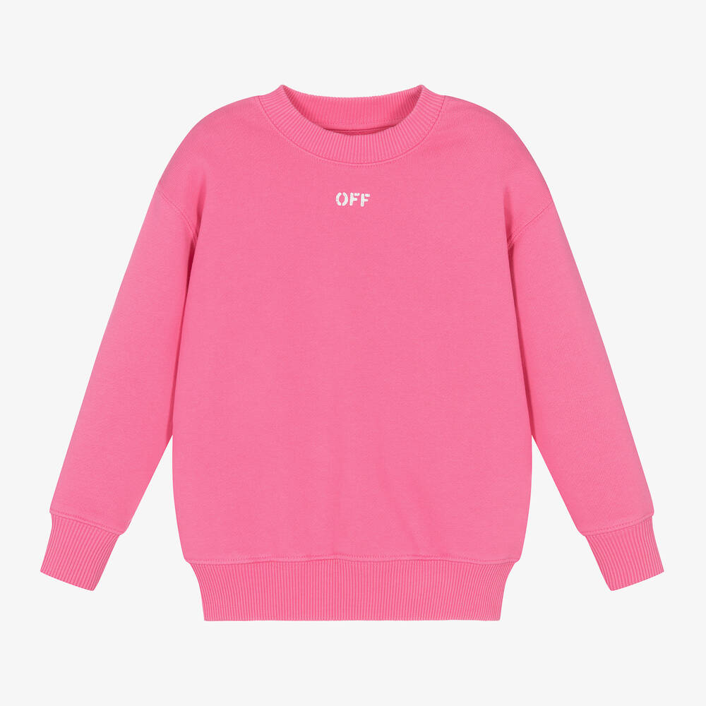 Casual and comfortable, this bright pink long-sleeved sweatshirt for boys and girls is by luxury streetwear brand Off-White. It is made in mid-weight cotton jersey and has cosy ribbed trims. The designer's small Off Stamp logo is printed in white on the front, with their iconic arrows logo in an oversized design on the back.