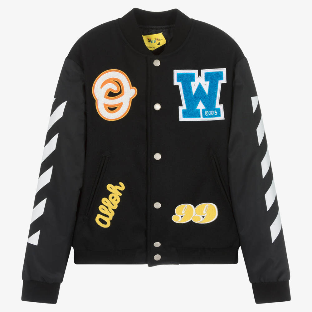Sporty black varsity jacket with an American college vibe for teen boys, unmistakably by Italian brand Off-White. It has colourful, embroidered patches on the front, the label's iconic white diagonals on the satin sleeves and a script logo embroidered across the back. It is made in a felted wool blend, with slanted pockets and logo popper fastenings on the front. Lightly padded for warmth, it has cosy ribbed trims and is lined with soft satin for comfort.