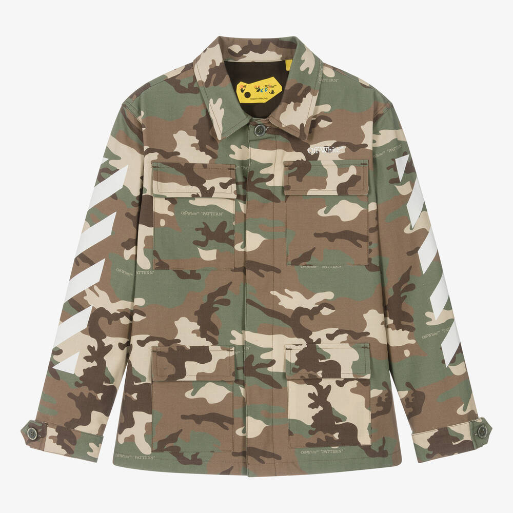 In a casual and urban style, this green and brown camouflage jacket for teen boys is by luxury streetwear label, Off-White. For an iconic look, it has white diagonals printed on the sleeves and a large arrow printed on the back. Made from a smooth midweight cotton weave, it has a white logo on the chest, four flap pockets on the front, and fastens with concealed buttons.