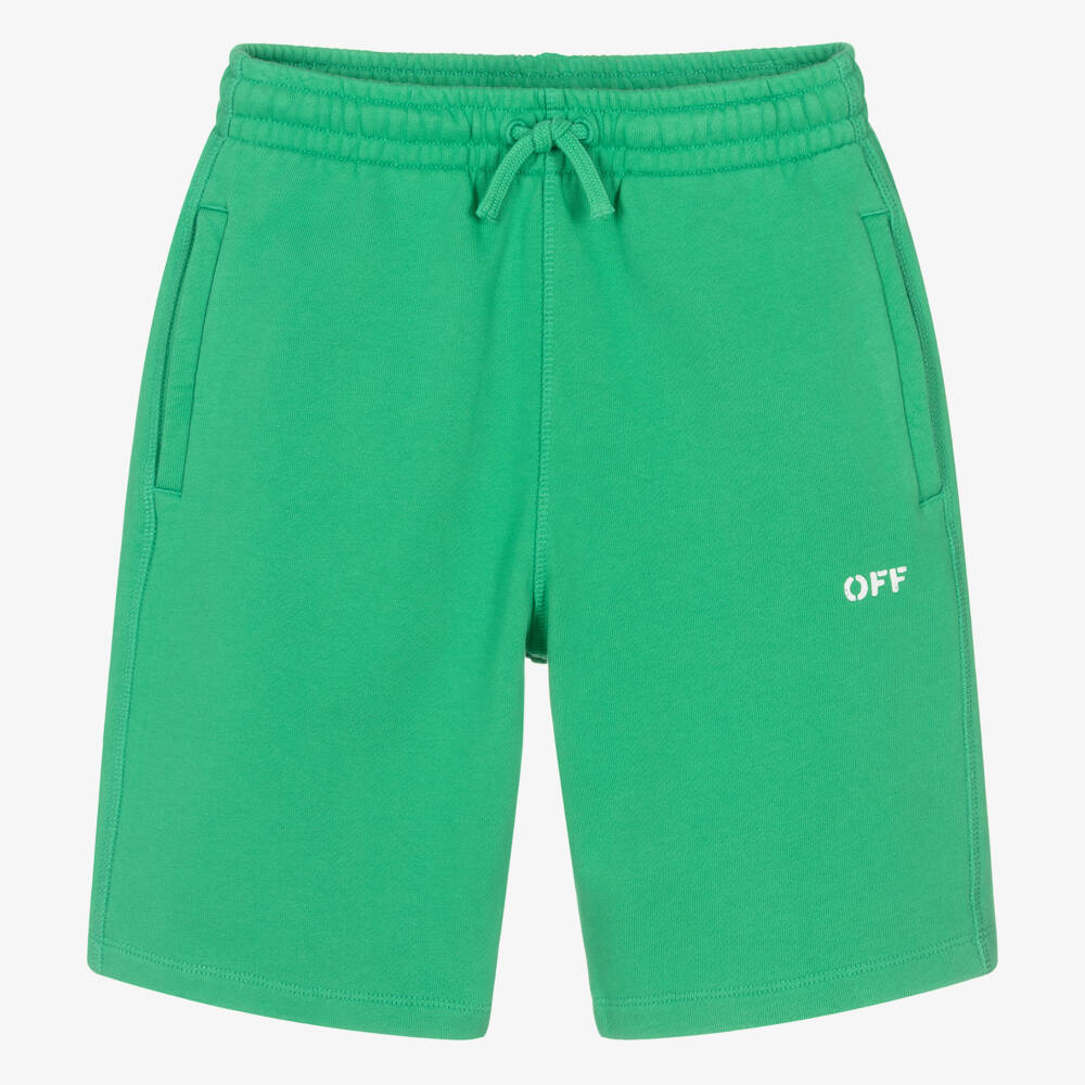 Comfortable whether active or lounging, these green cotton jersey shorts for teen boys and girls are by luxury streetwear brand Off-White. They are printed on the front with the designer's industrial-inspired Off Stamp logo. There are useful side seam pockets, and the elasticated waistband has a drawstring tie for an ideal fit.