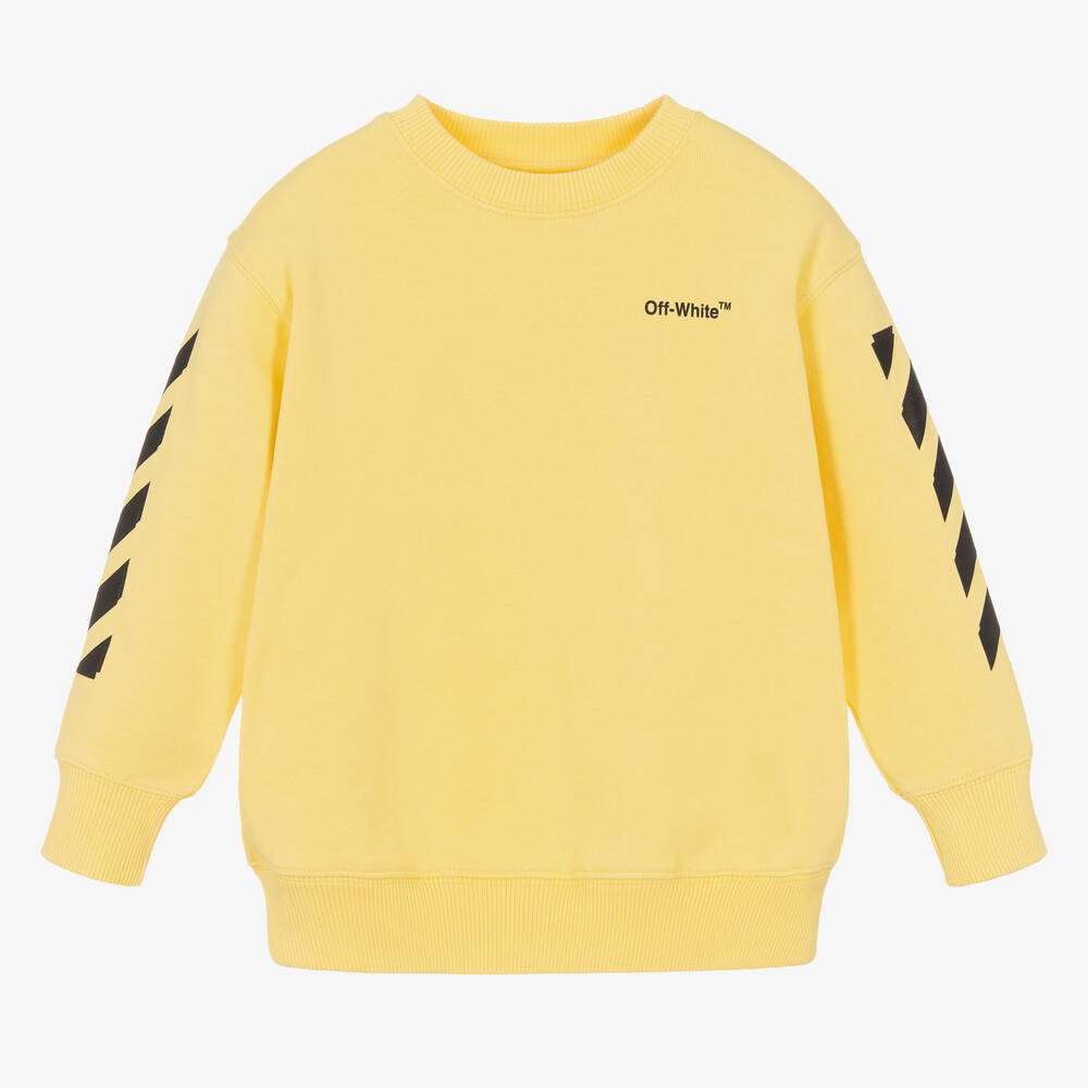 Designed by luxury fashion house Off-White, this pale yellow cotton sweatshirt is for boys and girls. In the label's on-trend streetwear style, there are diagonals on the sleeves, branding on the chest and arrows on the back, all stamped in bold black print. The medium-weight jersey fabric and softly ribbed trims ensure the sweatshirt is as comfortable as it is cool. This garment contains organic cotton yarn.