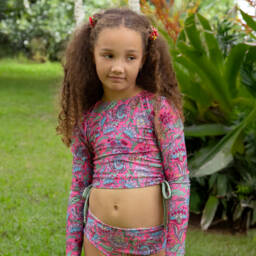 Pretty green bikini for girls by Olga Valentine, with a beautiful pink floral print. Silky soft and stretchy, it has a UPF50+ rating and is fully lined for comfort. The top part is ruched, with frilly trims and adjustable shoulder straps.