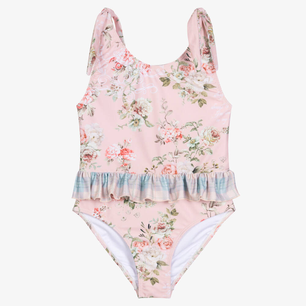 Pink swimsuit for teen girls by Olga Valentine, patterned in beautiful florals with a subtle logo script for a vintage touch. Made in silky smooth recycled fabric, this feminine piece features a ruffle detail around the waist in a contrast pink and blue pattern. With UPF50+ for added sun protection, this swimsuit comes fully lined for comfort, with tie straps on the shoulders.
